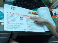 | 「わ〜い、でけたでけた」とはしゃぐ編集部新人I(右)、「内容もずっしり、ホームシアターづくりに役立つね」と目次を指差し自画自賛の編集部I(左) |