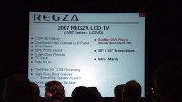 最後には、REGZAの2007年北米向け製品ラインナップが発表された。詳細は写真に譲るが、最上位シリーズにあたるLX177シリーズは、1920×1080のフルHDパネルのほか残像軽減、3系統のHDMI入力(HDMI1.3、DeepColor対応)などの機能が揃う。サイズは42型、46型、52型、57型と大型で北米先行で発売されるなど日本での展開については触れられなかったが、発売されることになればハイエンド液晶として注目のモデルとなりそうだ。