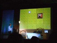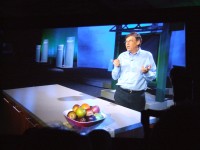 そして最後に「Connected Home of Future」と題して、ビル・ゲイツ氏が自らマイクロソフトが描く近未来のデジタルライフスタイルを実演してみせた。「バスの停留所で地域情報を呼び出してレストランの予約をする」という設定、「キッチンの調理台がコンピューターのディスプレイになって料理をサポートしてくれる(操作には音声認識を利用)」という設定、さらには「部屋の壁紙をパソコンの壁紙のようにしてしまう」という設定などを披露。ゲイツ氏の奮闘ぶりに、会場から笑いと拍手が起こった。