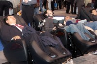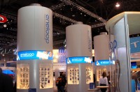 三洋電機のブースは、日本でもおなじみの充電池「eneloop」を強力に訴求。対応機器を大量に展示したほか、eneloopをかたどった巨大なオブジェも目を引く。また、ブースのあちこちに「Think GAIA」の文字が躍り、同社のキャッチフレーズは日本と北米で共通のようだ。