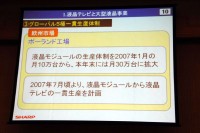06年度、薄型テレビの需要拡大が特に顕著だった欧州市場については、ポーランドに新設した工場が1月から月産10万台の体制で液晶モジュールの生産を開始している。本年末には月産30万台への拡大が予定されているほか、本年7月頃からは液晶モジュールからテレビまでの一貫生産が計画されている。