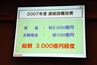 最後に同社全体の2007年度の売り上げ目標について、町田氏は「06年度計画の金額から10%増となる3兆3,000億円を目指したい」と語った。またこれを実現するための07年度の設備投資内容については、液晶事業に約2,000億円、太陽電池事業に約100億円、総額で約3,000億円程度が見込まれている。