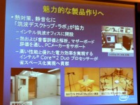 続いて、本機にチップを供給したインテル(株)マーケティング本部 本部長の阿部剛士氏が、オンキヨーとの協業関係について説明。HDC-1.0はアイドリング状態で22〜23dB程度の静音性を実現しているが、これはチップ面積の小さいCore 2 Duoを搭載したことが寄与しているほか、阿部氏によると筐体の設計にもインテルが協力を行ったのだという。「インテル筑波オフィスにある熱対策・静音化の研究施設『筑波デスクトップ・ラボ』で、熱および音響評価と解析、マザーボード評価を行い、静音化に貢献できた」。