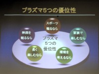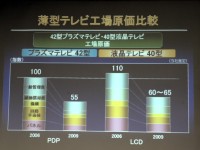 会見の中で同社副社長の川上徹也氏は、「PDPが液晶陣営に押されているのではないか」との質問に対し、別途用意した資料をもとに反論。42型プラズマテレビと40型液晶テレビの原価比較データを見せながら、「プラズマは特にパネル原価が低い。コスト面で有利だ」と主張した。さらに同氏は、「台数ベースで液晶が優位などと言われるのは、個人的にはおかしいのではないかと思う。15インチの液晶と50インチのプラズマは同列に比較できない」とし、比較の方法にも再考を促した。