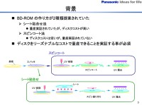 BD-ROMの詳しい製造工程は図に譲るが、BD-ROM登場当初提案されていたコスト高のシート貼合法に対して、低コストな製造が可能なスピンコート法は、ハリウッドのスタジオから実現性が疑問視されてきた。これに対して松下電器は、センターキャップを使うことで一定の厚みを維持する技術や、UV露光などの技術を組み合わせることで、スピンコート法による1層/2層ディスク量産を実証した。
