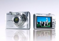 【SPEC】●撮像素子:有効1010万画素CCD ●レンズ:光学3倍ズーム、f38-114mm(35mm換算)/F2.8-5.1 ●液晶モニター:2.6型/11.5万画素 ●動画:640×480(HQ)、512×384(Normal)、320×240(LP) AVI形式、Motion JPEG準拠 ●記録メディア:内蔵メモリー(15.4MB)/SDHC/SD/MMC ●電源:リチウムイオンバッテリー ●外形寸法:91.1W×57.2H×24.2Dmm ●質量:約125g(本体)