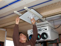 吊り下げは二人がかりだ。まずは天井プレート側をレールにまたがせ、安定を確保しよう。天井とのクリアランスがないので作業は窮屈。そこをクリアできれば半分成功したようなものである。連結アームは360度のフレキシブルになっており、さらに上下で分離できる。HD1本体ごともちあげ、エイヤっとフックを引っかけるようにセットすればOKだ。この位置だとほぼ110インチ投射だが、クロスハッチを出しながら台形歪みが出ないようにチルトを決める。上下80%、左右34%のレンズシフトとズーム&フォーカス調整で入念に追い込んで、いい感じに仕上がった。