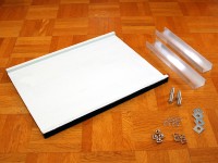さて前編で予告した“秘策”を披露しよう。「板状のものをレールに乗せ、そこに専用の取り付け金具を」というアイデアが固まってきたのは、あるモノを見つけたからだ。オーディオラック用のボードである。サイズは38×45センチほどだが、うまい具合にコの字型なのでレールから外れることもない。