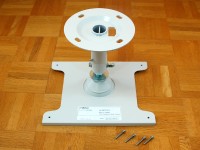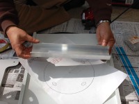 こうした作業には型紙をつくるのが一番だ。前半のハイライトは、天井プレートの4つの穴に、ボードとアルミ板をボルトどめすることだが、紙に書いた図面をそのままあてがい、現物に合わせで進めていく。一方プロジェクター側は底面の足を外して、そこに本体プレートをセット。これで準備作業完である。