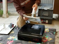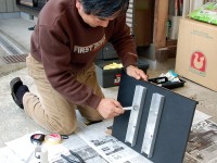 庭先での日曜大工はわくわくする。ボードは白く塗ろう。下から見たときの色あわせだが、HD1本体は精悍なブラックバージョンだ。プロジェクター取りつけ時の総重量は15.6キロ(金具が4キロ)。さほどの重さじゃないが、安全性を考慮してアルミ板2枚(これもコの字型)で補強することにした。専用の天吊り金具「EF-HT11」はよくできている。±15度のチルトや、ぐるっと一周まわせる水平パン機構が付いたスグレモノだ。でもそんな融通性も、土台をしっかり固定したうえでの話である。