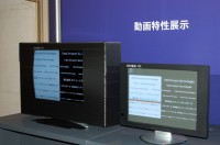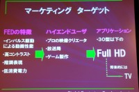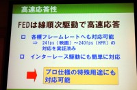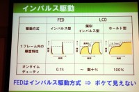 実際に、120フレームの倍速表示を行った液晶テレビと、60フレーム表示のFEDとで、細かい文字が書かれた動画を高速でスクロールさせる比較展示も行われていたが、液晶では映像がボケて文字が読めないほどなのに対して、FEDでは全くと言っていいほどボケが感じられない。高い動画解像度を実感することができた。