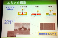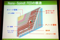 FEDはエミッターの構造によって、大きく3つに分けられ、それぞれスピント型、SED型、CNT型と呼ばれる。今回エフ・イー・テクノロジーズ社が開発したのはスピント型。SED型は、名前の通り、キヤノンが開発を進めている「SED」に用いられている。