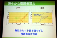 階調表現力が高いのもFEDの利点の一つで、ガンマ値は約3.6程度と、テレビ放送のガンマ特性のグラフに似ており、無駄なビット数を使わずに高い階調を表現できるという。