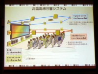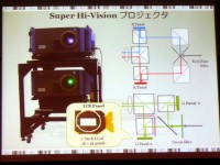 続いて同氏は、スーパーハイビジョンの開発の現状についての説明を行った。内容はこれまでの技研公開(関連記事)やスーパーハイビジョン生中継実験(関連記事)で紹介されたものに沿っており、22.2ch音声や評価用プロジェクターの概要、撮影用カメラ、伝送方法、ストレージ方法などを紹介した。