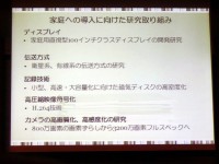 NHKが目指すのは、家庭のテレビにスーパーハイビジョン映像を届けること。同氏はこれを実現するために、「大容量の映像情報を撮影、記録、圧縮、伝送、表示するそれぞれのブレークスルーが必要だ。特に家庭で視聴するためには、100インチ程度のディスプレイの開発が重要となる」と説明した。