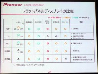 同社のPDPについては、第1世代モデルからの進化の系譜をパワーポイントで紹介。毎世代で新技術を投入し画質の向上を図ってきたことをアピールした。また、2006年に発売したPDP-5000EXで大きな評価を獲得したことや、先日発表した新モデルPDP-A507HXがさらなる新技術を採用したことを紹介。現在は、昨年のCEATECや年初のCESで公開した、次世代パネル(関連記事)の開発を進めていると説明した。
