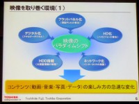 現在のテレビは、放送事業者、スポンサー、通信キャリア、メーカー、視聴者など、様々なステークホルダーを満足させる必要が出てきており、「これらのステークホルダーが求めるものが今後のテレビのスペックを決めていくだろう」というのが同氏の意見。さらに、ここ数年でデジタル化、ハイビジョン化といった映像コンテンツ自体の大きな変化や、HDDなどの小型・大容量化によるストレージの変化、AVとPCの融合の急速な進展など、様々な環境の変化が起こっていることを示した。