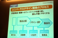 同社デザイン研究所 ホームシステムデザイン部 部長の中村泰久氏は、同社のユニバーサルデザインに対する取り組みを説明。独自の評価システム「UDチェッカー」を用い、ユニバーサルデザイン性能を定量的、客観的に評価しているという。「チェックは完成品だけでなく、三菱電気の全商品の試験や試作段階などにも適用している」。一例としてドラム部分が0度、15度、20度に動く洗濯機「ムービングドラム」を挙げ、洗濯物を入れる際の20度という角度も、多くの試験や評価によって導かれたものであることをアピールした。