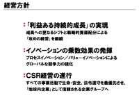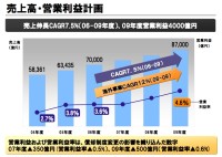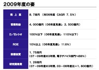 その上で経営方針として掲げたのは、「利益ある持続的成長の実現」「イノベーションの乗数効果の発揮」「CSR経営の遂行」の3点。特に持続的成長の分野では、「攻めの経営を継続」するとした。2009年には8.7兆円、営業利益は4,000億円を目標として掲げている。