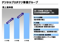 テレビやPC、HD DVD機器を要するデジタルプロダクツ事業の売上高は、主に海外で売り上げを伸ばす計画。06年度に70%だった海外売上高比率を、09年度には75%に引き上げる。同事業の売上高は、06年度は2兆7,800億円だが、09年度は3兆4,300億円に引き上げる予定。営業利益率は0.5%から1.6%に改善させる計画だ。