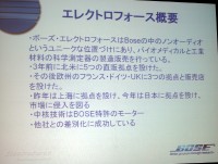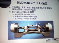 ボーズでは、車両用サスペンション(関連ニュース)など、本業の音響機器とは一見かけ離れた分野の製品開発も手がけている。このサスペンションは凹凸の激しい道でも快適な走行が行えるというもので、その技術の要となるのはリニア電磁モーター。このモーターには、スピーカーの動作原理をそのまま当てはめることができるため、技術のベースは同じものと言える。