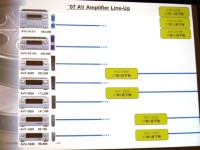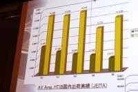 AVアンプ市場の現状について横間氏は、02年度には67億2,500万円だった国内出荷金額が、06年度には28億1,500万円と、半分以下に落ち込んだと説明。同じく下落傾向にあったパッケージタイプのホームシアターシステムは、薄型テレビの立ち上がりに合わせて、05年度の97億1,900万円が、06年度には116億3,500万円と盛り返したが、AVアンプは低下傾向に歯止めがかかっていない。