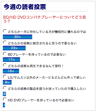 BD/HD DVDコンパチプレーヤー、約3割が「どちらかに特化望む」−「今週の読者投票」結果発表(7/9〜7/16)