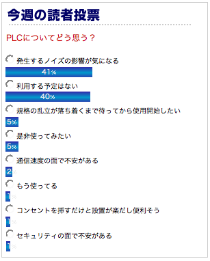 今週のお題は電灯線や配電線に通信信号を流すことでデータ通信を行う「PLC(Power Line Communications)」について。読者の投票結果は以下のようになった。