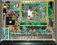 | 1. 広帯域パワーアンプII 2. HDMI、及びビデオアップコンバータ部 3. 低ジッター・ロスレスデコードエンジン 4. オーディオ/ビデオ・プリアンプ部 5. プリアンプ電源部 6. パワーアンプ電源部 ※画像は試作機のもの。市場投入時の製品ではトランスと電源コンデンサーが画像よりも大きくなる予定。 |
