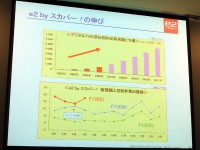 新規個人契約件数は、ドイツW杯のあった06年1Qには及ばないながらも、着実に件数を伸ばしている。内訳を見ると「e2 by スカパー!」(110度CS)の件数の増加が顕著で、仁藤氏は「受信機内蔵テレビの普及とともに伸びている」と説明する。e2の契約件数は2006年度末で40万件。2011年度までの中期経営計画目標は180万件としている。また、ハイビジョンチャンネルは現在3チャンネルだが、9月中に4チャンネル、2008年度に5チャンネル、2009年度に10チャンネルへと増やしていく予定だという。今後の取り組みとして同社は、サービス内容の認知度を向上させ、デジタルテレビの普及世帯のうち3.5〜4.0%程度の加入を目指していく。