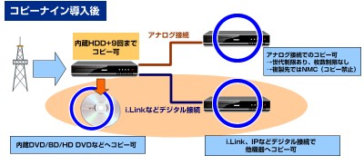 デジタル放送をHDDに録画してDVDや次世代ディスクに保存した場合には、9回という個数制限でコピー(1世代の世代制限はアリ)を行える。ちなみに10回目は従来と同じムーブとなる。アナログ出力については、世代制限アリの状態で何回でもコピーできる。