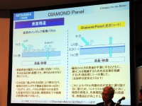 DIAMOND Panelは、表面に光沢コートとLR(低反射)コートを施すことで高い色再現性を実現した新開発のパネル。従来の非光沢処理パネルと比べ滑らかな表面が、パネル内部からの光の散乱を低減することで、暗所コントラスト3,000対1、明所(200ルクス)コントラスト1,200対1を実現している。また、光の散乱を低減したことで各画素の色のにじみを防ぎ、解像感の高い映像表示を実現している。