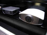 新BRAVIA プロジェクター、SXRD方式採用の「VPL-VW60」(製品データベース)と液晶方式の「VPL-AW15」(製品データベース)も展示。投射デモも行われていた。ハンディカムも記録メディアの違いによるモデルがズラリと勢ぞろいさせた。こちらは既発売だからか、自由に触ることができる。