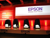 IFA開幕初日 (31日) 午後のキーノートスピーチには、セイコーエプソン(株)の代表取締役副社長である丹羽憲夫(にわ のりお)氏が登場。キーノートスピーチの目玉は、世界初披露(ワールドプレミア)となる液晶プロジェクターの新モデル4機種だ(関連ニュース)。