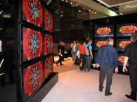 この演出はいうまでもなく新しいプラズマテレビ「KURO」シリーズの黒表現をアピールすることが狙いで、画面に映し出す映像も強いインパクトのあるモノクローム画像で統一した。その狙いは見事に成功していて、たとえば壁面に並んだ複数のPDPのアレイに黒が一斉に映し出された瞬間など、ハッとするような新鮮なビジュアル効果を作り出していた。