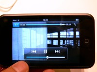 音楽再生時は、曲単位、アルバム単位、アーティスト単位などでリストを表示。ディスプレイの上に指を添え、軽く滑らすと画面がスクロールする。右側にはアルファベットが表示され、タップするとその文字部分にリストを移動できるが、文字サイズが非常に小さいため、正確にタップするのが難しい。指を置いた際、Mac OS Xの「Dock」のように、自動的にアイコンが大きくなるなどのギミックが欲しいところだ。
