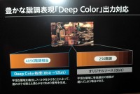 また、DeepColor出力も本機のみが対応している。放送波やBDの24p出力時など、あらゆるソースで使用でき、もとの各色8ビットの映像から、平坦な領域を検出、フィルターをかけることによって、滑らかな12ビットの映像を生成する。平坦でない領域にはフィルターをかけず、画のボケを抑えているという。なお、DeepColorはHDMI接続時のみ出力できる。