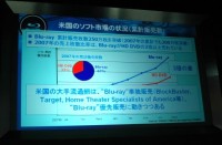 小塚氏は、多数のBD対応機器が商品化され、今回のCEATEC JAPAN 2007でも多くの新製品が展示されていることを取り上げ、「BDをサポートする企業の数が順調に増え続け、家電AV、PC、メディアメーカーの各方面でBDのプレゼンスが高まっている」と語った。BDの海外における状況について小塚氏は、「米国ではBDタイトルの売上げが好調に推移し、累計販売枚数は250万枚を突破した。月内には300万枚を突破するだろう」とし、また「米国の大手流通網はBDの優先販売に動きつつある」と語った。また、競合となるHD DVDとの売上げ枚数比率については、グラフのデータを示しながら、07年時点で「BDが67%」に対し「HD DVDが33%」であることを強調した。さらに中国ではパイオニアやソニーがハード機器の販売を開始したことや、中国国営の有力企業がBDAに参加したことなどが紹介された。