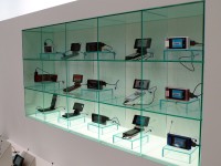 展示されたのは記者発表会(関連記事)で公開された各モデル。コントラスト10万対1、厚さ20mmという次世代のスペックに加え、従来の常識にとらわれない設置方法が目を惹く。屏風スタイルやガラスへの設置、ラックに収納するデザインなど、薄型化による様々な可能性を提案している。