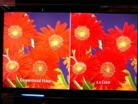一つはソニーが11月20日に発売する70V型BRAVIA「KDL-70X7000」に搭載したLEDバックライト技術”トリルミナス”だ。2004年に発売された液晶QUALIAに搭載していたものだが、新世代のものに進化し、消費電力を大幅に下げている。色空間の再現性をNTSC比125%まで向上させるこの技術により、赤色、特に従来課題だった真紅の色再現力の大幅な向上が見て取れた。