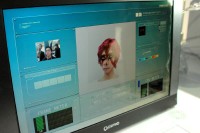 SpursEngineをノートPC「Qosmio」に内蔵した試作機も展示。この試作機では、「FACEMATION」という興味深いアプリケーションを体験できた。数年前のCEATECではCellで実行されていたソフトだが、今回はSpursEngineで動作させている。キャプチャーした顔写真から、目や鼻などの特徴点を抽出し、顔を3Dモデリングする。3Dモデリングした顔に、メイクやカツラを被せることができるうえ、顔を動かすと、リアルタイムでカツラやメイクを施した顔が動くというもの。デモ環境では、Intel製CPUとSpursEngineのどちらで処理させるかを切り替えることができたのだが、Intel製CPUではフレームレートが10fps強、処理パワー占有率が80%台だったのに対し、SpursEngineでは30fpsで動作し、占有率も30%程度に収まっていた。同プロセッサーの処理性能の高さが実感できた。
