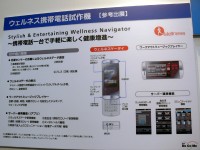 今回多くの人を引きつけたのは、参考出品されていた「ウェルネス携帯電話」の試作器。歩数計や脈拍計、体脂肪計、ブレス(口臭)の測定センサーを搭載しており、健康に関するさまざまなデータを測定・管理することができる。会場には5色のカラーバリエーションが用意されていた。iアプリによって摂取カロリーや消費カロリーのデータ管理も行える。データはネットワークを通じて家族や友人などと共有することも可能だ。歩数や消費カロリーはウィジェットでリアルタイム表示される。