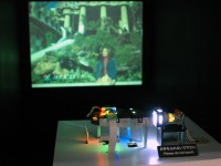 ブースに設けられた暗室では、最新技術として「大型3Dモニター」と「ハイブリッドモニター」のデモを行う。大型3Dモニターは、リアプロジェクションの画面に液晶パネルを重ねることで立体表示を実現する技術。前面、後面で、明るさの異なる同一の映像を表示することで、任意の奥行き位置を表現することが可能となっている。