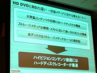 さらに藤井氏は、HD DVDとBDの違いについて改めて説明。大容量コンテンツの記録にはHDDが最適であり、ストレージメディアは機能やコストに応じて使い分けることが重要、光ディスクはその選択肢の一つであるという、藤井氏がこれまで展開してきた主張を改めて強調した。BDを含めた光メディアについては、「30GB、50GBというのはHDの記録には不足」とし、HDDやHD DVD、CDなど、様々な記録メディアの特徴をまとめた比較表を表示しながら、あくまでハイビジョンコンテンツの録画にはHDDレコーダーが最適であると説明した。