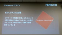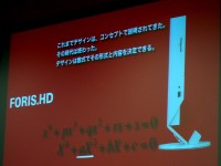 FORIS.HDのデザインについては、「スタンドと本体の接点を最小にし、浮遊感のあるデザインを目指した」という。また、スピーカーを内蔵した直方体の部分には、ピタゴラスの定理で有名な比率“5対4対3”を取り入れており、「人間の英知の出発点といえるこの定理が、ハイビジョン時代の新しい情報の扉を形づくっている」と説明した。またスピーカーについては、「350ccという限られたエンクロージャーの容量で、いかに低域の再生を行うかという問題に突き当たった。以前、BOSEの社長に教えてもらった倍音技術をヒントに設計を行った」という。