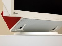 スピーカー部は、デザイナー川崎氏がこだわった、斜め下向きの新開発スピーカーを採用。スピーカーから出た音をテレビ台に反射させることで、低音感を増強している。また、指向性の強い高音域を拡散させるためのディフューザーを装備。これにより、臨場感のあるサウンドを実現しているという。