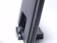 音響にこだわったというスピーカー部は、17mmの薄型デザインを採用。ユニットはトゥイーター、ウーファーによる2ウェイ構成となっている。周波数特性は140Hz〜20kHzで、最大出力は総合9W。iPodドック部は折りたたみが可能で、持ち運びにも便利だ。本体背面にはUSB端子を装備。PCと接続することで、iPodとiTunesの同機なども行うことが可能だ。