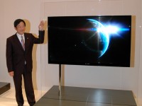 また、昨年話題を呼んだ新技術による“超薄型液晶”については、本年度中に製品化を行う予定であることを明らかにした。会見の会場には、新たに試作された65V型の“超薄型液晶”も展示。同機は、52V型と同等の技術を投入しており、厚さ20mm、コントラスト比10,000対1を実現している。消費電力を大幅に抑えることにも成功しており、年間消費電力は200kWh/年を実現しているという。
