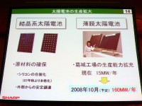 『世界No.1の液晶〜』について同氏は、「シャープの液晶は世界最高水準であると自負している」と語るとともに、多岐にわたるデバイス群を揃えていることをアピールした。また、『省エネ・創エネ機器〜』については、今後需要の高まりが予想される太陽電池に、より一層力を入れていくと説明した。