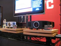 BD陣営でディスクを生産供給する素養もありながら、なかなかBD機を発売しないビクターだが、やはり高級「PROCISION」ブランドのコーナーでBDプレーヤーの最新試作機が参考出品されていた。しかもプレーヤーからの映像再生を行っているので、モックアップではない。そろそろBDプレーヤー1号機が登場するかもしれない。隣に同一デザイン仕様のAVレシーバーが並ぶが、こちらはモックアップであった。また、試聴室を構えてフルHDプロジェクターのDLA-HD100のデモも行われていた。